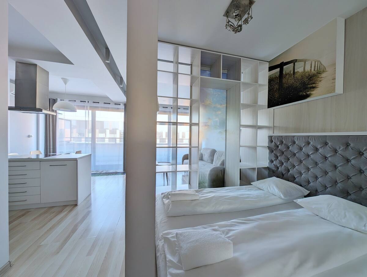 SkÅ‚ada siÄ™ z salonu z aneksem kuchennym, oddzielnej sypialni, Å‚azienki i dużego balkonu. WnÄ™trze urzÄ…dzone jest w miÄ™kkich kolorach, z niebieskimi ozdobami. Mieszkanie jest w peÅ‚ni wyposażone, a jego zaletÄ… jest balkon z widokiem na ulice Krakowa. To wybór dla tych, którzy chcÄ… zrelaksować siÄ™ w przyjemnym otoczeniu. Odpowiednie aranżacja umożliwia bezpÅ‚atny pobyt w tym samym czasie dla czterech osób. Sprawdź podczas podróży sÅ‚użbowych i wakacji z bliskimi.